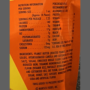 © NABISCO FOODS, INCSAMPLE-NOT FOR CONSUMER SALE INGREDIENTS: SUGAR, ENRICHED WHEAT FLOUR, [CONTAINS NIACIN, REDUCED IRON, THIAMINE MONONITRATE (VITAMIN B1), RIBOFLAVIN (VITAMIN B2)], PARTIALLY HYDROGENATED COTTONSEED AND SOYBEAN OILS, OAT FLOUR, COCOA PROCESSED WITH ALKALI GRAHAM FLOUR, BROWN SUGAR, NONFAT DRY MILK, HONEY, LECITHIN, GLYCERYL MONOSTEARATE, SALT, ARTIFICIAL FLAVOUR, BAKING SODA.